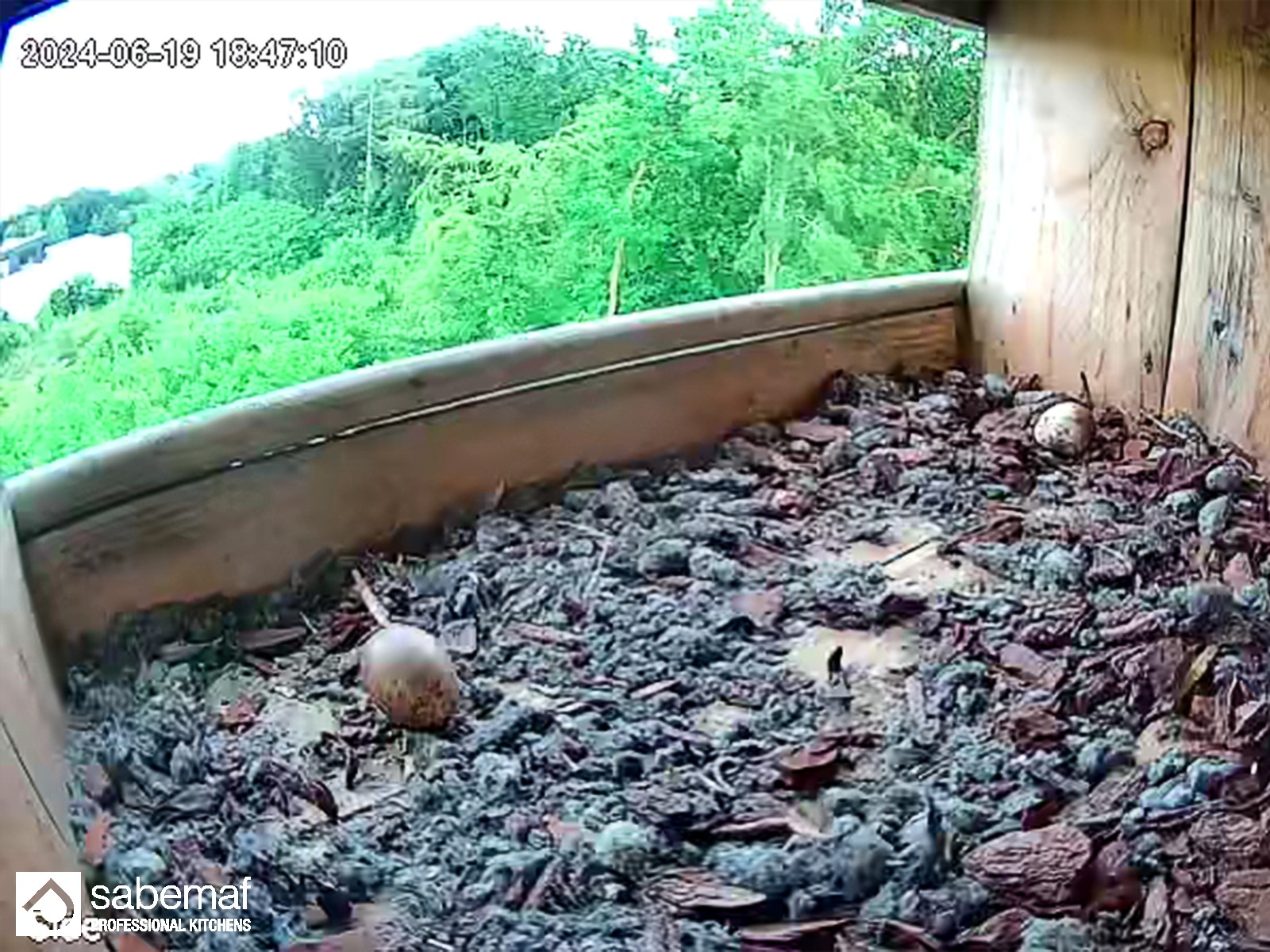 De incubatieperiode, normaal 28 tot 32 dagen, is lang voorbij. Hoewel de ouders tot gisteren om beurten bleven broeden op hun eieren, gelegd tussen 29 april en 8 mei, zijn ze vandaag weggevlogen nadat ze de schaal van de 2 laatste eieren hebben doorboord…